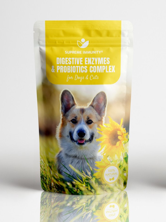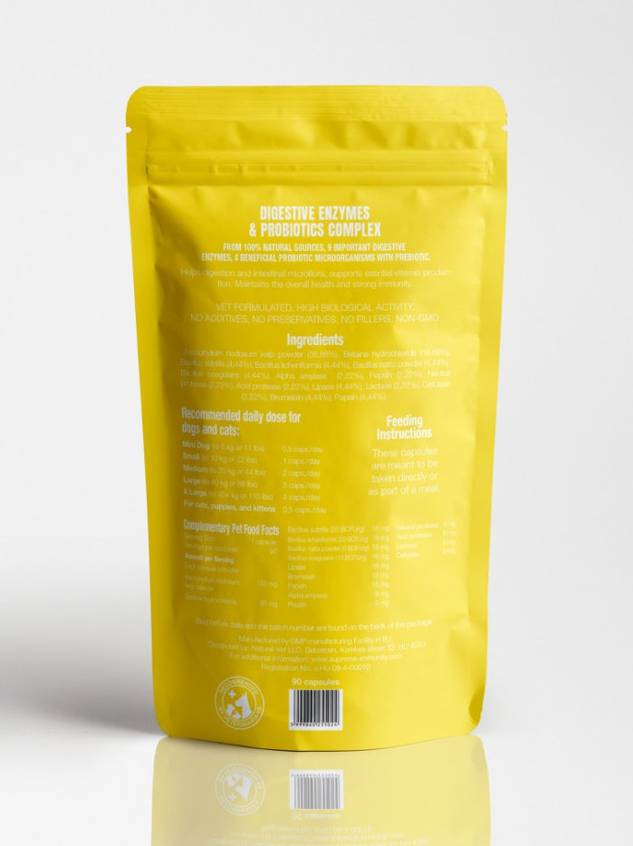 Supreme Digestive Enzymes & Probiotics olyan emésztőenzimeket (9) tartalmaz, melyet a károsodott gyomor és bél fal és hasnyálmirigy nem tud elegendő mennyiségben kiválasztani így folyamatos rothadás és erjedés történik a bélben a nem megfelelően megemésztett táplálék hatására, továbbá olyan flórát tartalmaz ami a bélflóra teljes újra településéhez segíti az állatot és nem érzékeny a gyomorsav károsító hatására sem. Az emésztőenzimek segítik az emésztést, a táplálék lebomlását és hasznosulását, kiegyensúlyozzák a savtermelést.